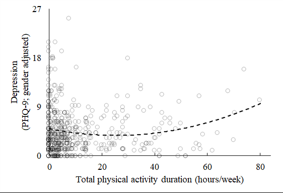 図:東京医科大学の研究(志村・井上ら, 2023)によれば、運動時間が1日3〜4時間程度(歩行や家事も含む)の人が最も抑うつ症状(PHQ-9スコア)が低く、運動不足(極端に少ない)や運動過多(極端に多い)の場合はメンタルヘルスが損なわれる傾向が示されました。 (出典: “Too much is too little: Estimating the optimal physical activity level for a healthy mental state”|Frontiers in Psychology, 2023年)
